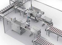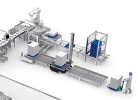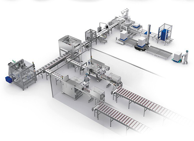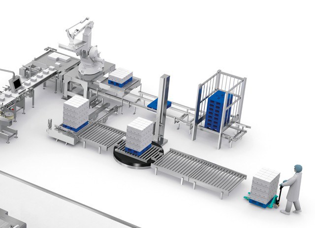 Роботизированная система паллетирования формирует паллеты, которые далее направляются к упаковщику для обертки в стрейч-пленку.