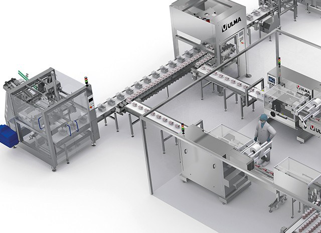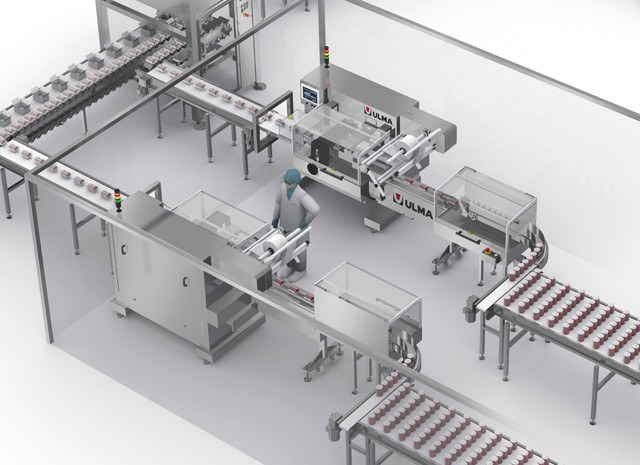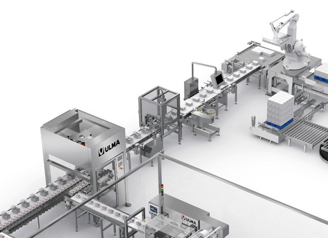 Робот по загрузке продукта подбирает продукт с транспортера подачи, и загружает продукт с двух линий в картонные короба.
