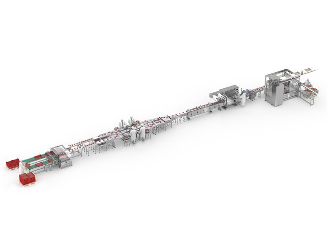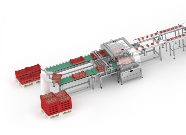 Короба с лотками сначала поступают в систему выгрузки по двум транспортерам, а затем на упаковочную линию.
