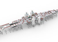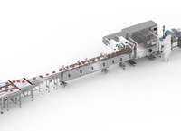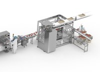 Система упаковки коробов принимает предварительно сформированные картонные короба и автоматически загружает в них лотки.