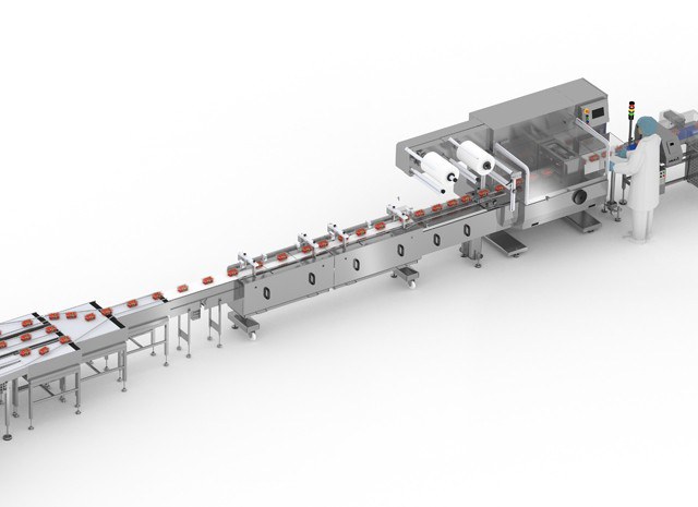 Упаковочная машина типа флоу-пак отвечает за индивидуальную упаковку каждого лотка клубники. Автоматическое устройство подачи располагает лотки наиболее оптимально, оставляя необходимое пространство между ними.