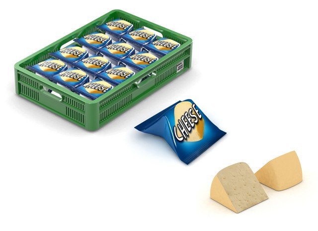 Блоки сыра поступают в упаковочную машину с подающего конвейера. Перед этапом герметичного закрытия упаковки, которая формируется вокруг продукта, упаковщик создает модифицированную атмосферу внутри, что продлевает срок годности продукта.