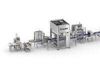 Полная линия полностью автоматизированной упаковки блоков сыра в мягкую упаковку на термоформовочной машине.