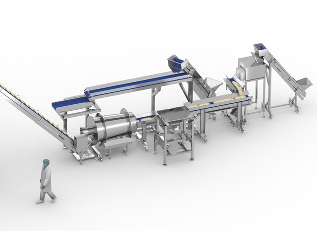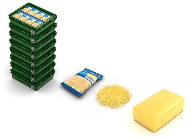 Упаковочная линия начинается с терки для сыра, далее тертый сыр направляется в специальный барабан, в котором сыр смешивается с крахмалом, чтобы предотвратить склеивание продукта в упаковке.