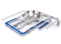 Система распределения потоков продукта подает две упаковочные линии флоу-пак и буфер для продукта для подачи в систему распределения.