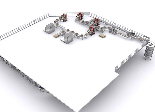 После того, как короба заполнены, они поднимаются на элеваторе на верхний этаж, затем автоматически закрываются и доставляются на конвейерных лентах и нисходящую спираль в зону готовой продукции.