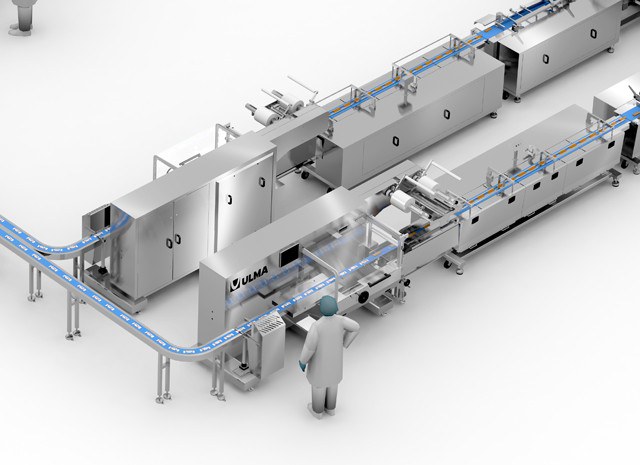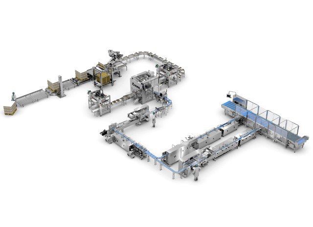 Система распределения потоков продукта отвечает за роботизированную загрузку в две горизонтальные упаковочные машины для первичной упаковки.
