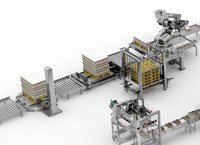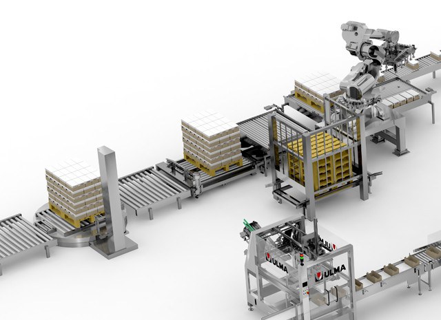 Роботизированный механизм паллетирования отвечает за формирование паллет, которые затем оборачиваются эластичной пленкой.