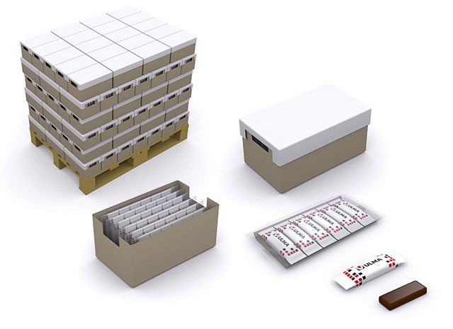 Полная линия для упаковки шоколадных батончиков, которая включает в себя первичную и групповую упаковку, а также упаковку в короба.
