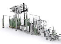 Устройство для разгрузки пластиковых ящиков извлекает ящики для подачи к упаковщику.