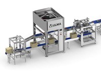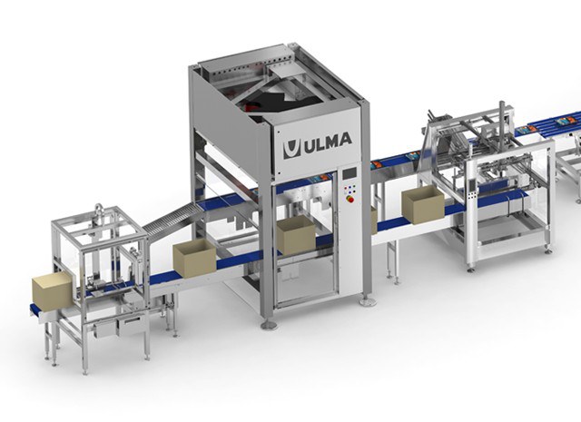 Формовщик картонных коробов формирует их из листов картона, далее робот заполняет их упакованным продуктом, поступающим из вертикальной машины.
