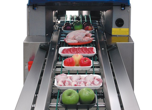 Автоматическая машина для упаковки продуктов в лотках в стрейч-плёнку. Высокая производительность. Специально разработана для супермаркетов и упаковочных центров.