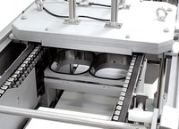 Термоформер в гигиеничном исполнении для упаковки в мягкую и в жёсткую плёнку с опциями упаковки в МГС и вакуумирования. Средний уровень производительности.