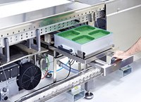 - Системы конвейеров для разворота упаковки или для объединения упаковок в один потов после термоформера.