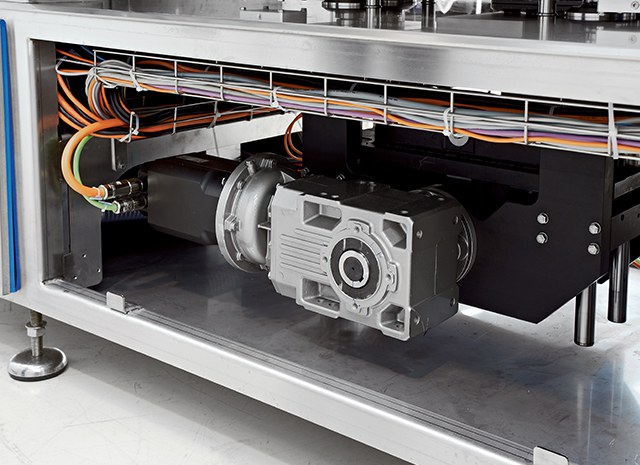 Подача и позиционирование лотков осуществляется ленточным конвейером с барабанным двигателем
