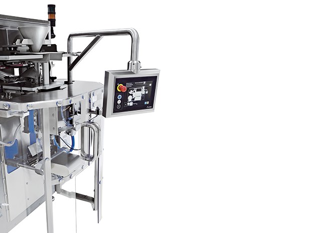 Вертикальная упаковочная машина (VFFS) с гигиеничным дизайном и с опцией легкой смены формирователя рукава. Разработана для непрерывной упаковки на высоких производственных скоростях.